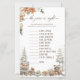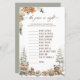 Traga um entusiasmo para a sua celebração com este Jogo de Chá de fraldas "Preço é Certo" dos Animais da Floresta de inverno. Convidados podem adivinhar os preços de itens comuns para bebês, e aquele com o total mais próximo ganha! Projetado com animais pintados à mão de madeira de cor d'água, verde-neve e detalhes da fatia de madeira rústica, este cartão de jogo imprimível coordena-se perfeitamente com a coleção de chás de fraldas do cheio Winter Wonderland. Uma forma festiva e interativa de entreter convidados na sua floresta ou no seu chá de fraldas de férias.