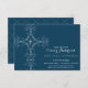 Este elegante cartão de convite para a primeira comunhão apresenta uma cruz ilustrada com ornamentado e uma cruz mais pequena com iniciais (monograma) de cada lado. A cor de fundo é marinho azul, e pode ser personalizada para o seu gosto, juntamente com o texto para a sua ocasião religiosa especial.