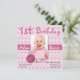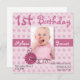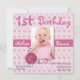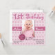 Bonito fundo floral cor-de-rosa neste doce convite de aniversário quadrado. Uma área de fotografia, no meio, para a foto da criança de aniversário e uma flor branca cor-de-rosa decoram o fundo da foto. Todo o texto é personalizável para atender às necessidades de sua parte. Perfeito para o primeiro aniversário da sua filha. Os convites ao quadrado podem correr mais alto no correio, verifique se o escritório local do posto tem taxas.