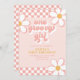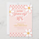 Uma Groovy Girl Retro inspirou o primeiro convite de aniversário com fontes e margaridas do estilo 70 e padrão de verificador.