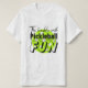 Esta camisa de picleball captura com humor o sentimento de que o prazer inicial de jogar pijama eventualmente dá lugar à diversão viciante, enfatizando a natureza irresistível do esporte que é engajada.