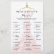 Diversão e na moda do que está no seu cartão de jogo de chá de panela. Jogo divertido para jogar na sua festa de chá de panela. Vestido cor-de-rosa pincelado elegante com cabide dourado exibido no fundo. Design com pontos que variam de 1 ponto até 100 pontos. O cartão de jogo pode ser personalizado com seu próprio sistema de ponto, assim como com as listas de itens.