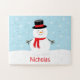Estes quebra-cabeça fazem grandes presentes do Natal ou stuffers da meia! Este quebra-cabeça personalizado caracteriza um boneco de neve festivo do feriado com um lenço vermelho. O fundo é claro - azul com flocos de neve de queda.