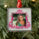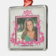 Este doce quadrado na moda ornamento superior da foto de 16 aniversários tem um design cor-de-rosa fúcsia quente do redemoinho em torno de um quadro no centro. Há um fundo floral cinzento desvanecido. No meio, você pode facilmente personalizar este com sua fotografia. Na parte inferior, o doce 16 é escrito.