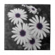Esta imagem mostra um aglomerado de margaridas com pétalas brancas e polos púrpuros-azuis em greve. O fundo e a folhagem estão em preto-e-branco, criando um efeito colorido seletivo que enfatiza as cores vívidas dos centros das flores. O contraste entre os arredores dessaturados e as delicadas flores dá à imagem uma qualidade artística, quase surreal, destacando a beleza e a complexidade da natureza.