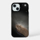 O conceito do artista do objeto interestelar que caminhava, Oumuamua, correndo em direção aos arredores do nosso sistema solar. O objeto, aquecido pelo Sol (inferior direito), despeja material gasoso de sua superfície, como um cometa faria. As órbitas dos principais planetas estão incluídas para escala. A constelação em forma de caixa Corvus está no fundo perto do centro de imagens, e a estrela azul brilhante Spica está no canto superior esquerdo do centro, na constelação Virgo. As estrelas no fundo à esquerda pertencem à constelação Hidra.