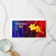 Obrigado, Cartão com fotos. Flores amarelas, fundo vermelho e azul.