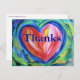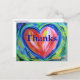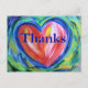 A mensagem no cartão-postal diz: "Obrigado". A pintura apresenta um coração vermelho colorido com brilhos de acentos brancos e dourados. O coração é delineado em azul e tem um fundo verde suave. Esta pintura do coração é uma homenagem a manter a esperança dentro do seu coração quando os azuis tristes o cercam, mas avançando para a renovação verde.