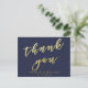 NewParkLane - Cartão postal elegante, com 'Obrigado' em tipografia elegante de folha de ouro falsa, contra um fundo azul-marinho. Fácil de personalizar no Zazzle com seus próprios nomes, data ou outro texto para um design personalizado. Todo o estilo de texto, cores e tamanhos podem ser modificados para atender às suas necessidades. Você também pode alterar a cor do fundo para qualquer cor que preferir.