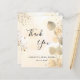 Um cartões de agradecimentos Chá de panela. Um fundo de cor aquosa de ouro decorado com ouro eucalipto e pó dourado falso. Na frente, um grande script de cor preta, escrito à mão, e o texto: Obrigado, seu texto, título e uma data. Voltar: Personalize e adicione seu nome e nota de agradecimento.