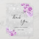 Um cartões de agradecimentos para um aniversário de 50 anos (ou qualquer idade). Uma cor de fundo metálica de aparência fina prateada. Decorado com flores roxas e pó brilhante falso. À frente, um grande texto escrito à mão e o texto: Obrigado, seu texto, título e uma data. Voltar: personalize e adicione seu nome e nota de agradecimento.