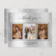 Adicione 3 das suas fotos de aniversário, tamanho vertical, uma data, nome e a nota de agradecimento. Um fundo metálico prateado falsa com texto e quadro pretos, um brilho falho. O texto: Obrigado na parte frontal e seu nome no verso é escrito com um roteiro à mão com na moda com baloiços.
