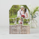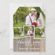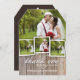 O fundo de madeira rústico, resistido e a mistura elegante de tipografia ajustam o palco para uns cartões de agradecimentos bonitos do casamento do país para a família e os amigos. Com sala para uma multi colagem da foto de suas fotos do casamento, este design molda três fotos menores e uma grande foto com uma beira da grão de madeira simulada na rotulação cursive inferior e bonito. Adicione uma fita bonito de seu tema da cor do casamento através do furo na parte superior da forma do Tag para um olhar realmente especial!