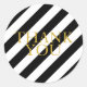 Etiquetas listradas a preto e branco com ouro.
