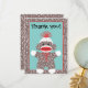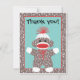 Tão bonito! O macaco adorável da peúga do bebê agradece-lhe neste fundo do azul do aqua. Excelente para o aniversário, o nascimento ou o obrigado do chá de fraldas você notas ou apenas porque você ama macacos da peúga! A parte traseira tem a sala para sua nota. Ilustração tirada mão por McBooboo