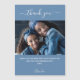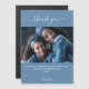 Uma cor de fundo azul empoeirada. Escrito branco, com letras grandes e manchadas, e o texto: Obrigado. Personalize e adicione sua foto, obrigado nota e nome.