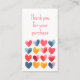 Mostre seu apreço aos seus clientes com o nosso Obrigado por sua nota de compra de coração de amor Inserir cartão. Esta carta encantadora apresenta um design encantador com corações amorosos em vários tamanhos e cores vibrantes, criando uma impressão alegre e animadora. Ele serve como uma adição perfeita ao seu pacote para expressar gratidão pelo suporte e lealdade de seus clientes. Esta placa de inserção oferece espaço amplo para uma mensagem personalizada, permitindo que você transmita seus obrigados sinceros. Quer você seja um proprietário de uma pequena empresa ou um vendedor on-line, o nosso Obrigado por Sua Adquirência de Amor Compras Cartão de Inserção é uma maneira significativa de deixar uma impressão duradoura e mostrar aos seus clientes quanto você valoriza o suporte.