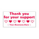 Este design de carimbo contém a mensagem de agradecimento "Obrigado pelo seu suporte" e um nome personalizável da empresa. Ele também apresenta uma forma decorativa de coração. Ele poderia ser usado por uma empresa, um negócio, uma organização ou um profissional para mostrar gratidão a clientes ou clientes pelos seus negócios.