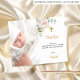 Um cartão de agradecimento de batismo moderno e elegante. Um fundo branco chic decorado com uma flor branca aguarela, peônia, folhagem de eucalipto e folhas de ouro falso. Personalize e adicione sua foto da criança, nota de agradecimento e nome.