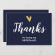 Elegante cartão de agradecimento de casamento com coração de folha falsa dourada e escrita moderna em branco. A frente e o verso do cartão são em azul-marinho chic.