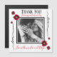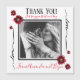 Obrigado! Personalize uma mensagem curta e seus nomes. Elegante design de casamento de papoila vermelha. Adicione uma foto do casamento, ou uma foto formal. O cartão está vazio na parte de trás da sua mensagem escrita à mão. Tipografia negra para Obrigado. Mão escrita Amor pelos lados. Sua mensagem e seus nomes em vermelho.