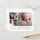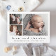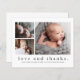 Um doce anúncio de nascimento de colagem de 3 fotos e um cartões de agradecimentos com um simples tipo moderno e 3 fotos na frente. A parte traseira tem um cabeçalho de nome de cheio grande e uma mensagem pessoal da família. Clique no botão editar para personalizar este design com suas fotos e detalhes.