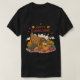 Uma vibrante design de T-shirt de Ação de Graças, com um peru lúcido a segurar uma faixa de "Graças e abençoado", rodeada por folhas coloridas do outono, abóboras e elementos da cornucopia. O design irradia calor com tons ricos de laranja, vermelho e ouro, encapsulando o espírito festivo de gratidão e união.