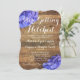 Rustic Country Western Getting Hitched Barn Wood Invitation Modelo com flores de hydrangea roxas em cantos opostos no topo e no fundo. A mesma madeira de celeiro e design floral roxo estão no fundo, juntamente com a palavra "Amor".
