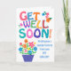 Um cartão de saudação brilhante e alegre da cirurgia de quadril, com letras coloridas e padronizadas e flores. Há bolinhas, chevrons e listras na letra 'Get Good Logo' e 'Desejando-lhe uma rápida recuperação da sua CIRURGIA HIP está em azul. Por favor, sinta-se à vontade para personalizar a mensagem dentro, se quiser.