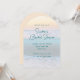 Convites de chá de panela do sol oceânico. Texto azul-verde é impresso sobre uma cena oceânica com um nascer do sol ouro. Adicione todas as informações da parte no formulário de parágrafo adicionando espaços e texto conforme necessário. O nome da noiva e o título da festa estão na fonte moderna do script. Mostrado no cartão de forma do arco, com outras opções. Use também a opção de download para compartilhar este convite online.