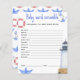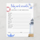 Este é um tema náutico Ahoy, é um menino! Chá de fraldas. Elementos náuticos aquosos - veleiro (barco de papel), farol, âncora, nós náuticos na boia. Itens correspondentes disponíveis. Respostas: CRAVINGS, CRYING, PACIFIER, FRASCO, LUZ NOTURNA, LULLABY, STROLLER, EPIDURAL, BURP, ALTA CADEIRA, SACO DE FRALDA, SWADDLE