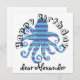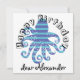 Polvo listrado azul legal e horizontal com texto: Feliz Aniversário e um nome modelo. Clique em personalizar e altere o nome para o seu.