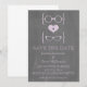 Anúncio de Quirky e chique Óculos de Geek Loja de Giz Salve a Data em roxo, apresentando um coração fofo ladeado por dois pares de óculos nerd, um par masculino e um par feminino representando o noivo e a noiva em um fundo com visual de lousa de giz. Este convite de save the date fora do comum é perfeito para anunciar seu casamento geek! Fácil de personalizar, basta adicionar os detalhes do seu casamento nos campos de texto fornecidos. Clique no botão "Personalize" para encontrar opções adicionais de personalização.