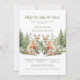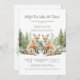 Adorável tema de raposas gêmeas com aquarelas, para um chá de fraldas de gêmeos brancos, com palavras engraçadas — "Oh, pelo amor... são gêmeos!". Esta design traz charme de floresta com uma torção divertida. Disponível no impressão, como download digital ou ambos! Natureza terra, matizes castanhos e verdes. Raposa e pinheiros florestais da floresta no verso do convite.