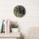 Uma bela fotografia de um okapi no zoológico impressa em um relógio de parede redonda.