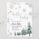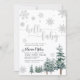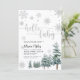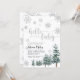 Olá, convite de bebê. Chá de fraldas de inverno com efeito de brilho prateado e pinheiros com aquarela.