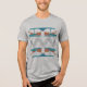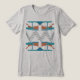 Em destaque está uma combinação abstrato de formas e linhas na turquesa orangem, e azul-lacre, criando um padrão horizontal com linhas ziguezaguis, influenciada pelo estilo artístico nativo americano/sudoeste. Foto aqui em uma camiseta "cinza atlética" Bella+Canvas com três blendas em Impressão Clássica, com outras cores e estilos disponíveis. O design projeta uma qualidade superior, colorida e artística para uma adição versátil e moderna ao seu visto casual e diário (seja em casa, socializando com amigos, praticando esportes ou correndo sobre a cidade). A design de camisa como "arte 'vestível'" também expressa um sentido de seu estilo individualizado, contribuindo para o sentimento de ser "unido" e criativo em suas escolhas pessoais de guarda-roupa.