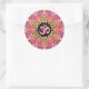 Potente mandala geométrica energizante no centro de amora rosa, amarelo, profundo, roxo, com símbolo Om ouro colocado em camadas.