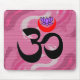 Produto: yoga mousepads — Design: símbolo único om com lua vermelha e lótus roxo — Fundo: abstrato cor-de-rosa