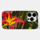 Uma fotografia de um lírio do dia vermelho e amarelo, com gotas de água nas pétalas e folhas.