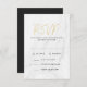 Cartões de resposta de casamento elegantes e modernos apresentam uma fonte de letra trendy dourada falsa, fundo de mármore branco e espaços reservados para as opções do seu menu de casamento personalizado. O verso dos cartões de RSVP de casamento elegantes pode ser alterado para uma cor de sua escolha com a ferramenta Personalizar.