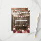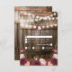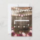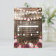 Cartões de RSVP de casamento campestre com um fundo de barril de madeira rústica, luzes de corda cintilantes, flores de aquarela burgundy e rosa, seu monograma e um modelo de RSVP de menu de casamento editável elegante.