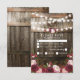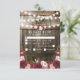Cartões de RSVP de casamento no campo com fundo de barril de madeira rústica, luzes cintilantes, flores em aquarela burgundy e rosa, seu