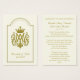 Um tributo eterno ao Sacramento do Matrimônio Sagrado, este cartão de oração de casamento católico mostra o radiante monograma Marian coroado e enquadrado dentro de um arco gracioso. A frente proclama "Unida a Jesus Através de Maria" acima dos nomes e da data do casamento da noiva e do noivo. Dentro é uma benção nupcial e sentida pedindo fé, caridade, paz e a intercessão da Bênção Virgem Maria. Ideal como um favor de oração, devoção de noiva, ou guarde seu dia sagrado.