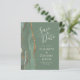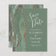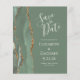 A borda esquerda deste elegante casamento moderno salve o cartão de data apresenta uma faixa verde-aquarela agata bordada com falso brilho dourado. O texto personalizável combina manuscrito de marfim, fontes em copperplate e itálico em um fundo verde de sábio. O verso apresenta um design verde-sábio e um agate dourado correspondentes.
