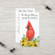 Watercolor Cardinal e Girassóis com eucalipto Simpatia de Oração Funeral Cartões de Oração Funerários. Este moderno, mas elegante cartão de oração memorial apresenta um pássaro cardeal vermelho em um buquê de girassóis. Frente "In Loving Memory" Personalize este cartão de oração funerária memorial com o nome e datas dos seus entes queridos e o sentimento. Volte ~ 'Que você sempre caminhe ao sol' Poema, que pode ser personalizado, por favor, alcance se você quiser uma design com um poema específico que não seja. Este cartão de oração memorável será um guardião precioso, para os serviços funerários e para a celebração da vida. COPYRIGHT © 2020 Judy Burrows, Black Dog Art - Todos Os Direitos Reservados. Oração Funerária Memorial Cartão Girassóis Cardinais