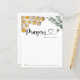 A placa de atividade do chá de fraldas apresenta coloração d'água, coloração d'água, verde eucalipto e abelha buzinada. O cartão de orações incita os hóspedes a compartilhar orações para que os pais se preparem para o bebê.