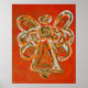 Pintura de um anjo branco e dourado sobre fundo laranja.