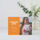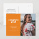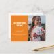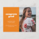 Anuncie a grande conquista do seu formando com este anúncio e convite de graduação simples, mas na moda. Ele apresenta as palavras "felicats formando" em uma fonte branca com estilo retrorreflector em um fundo laranja, assim como espaço para uma foto na frente. Use o cartão postal para obter detalhes sobre a celebração do seu formando.