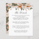 Este elegante cartão de informação floral verde, marfim, laranja e verde-musgo apresenta borda botânica de flores delicadas no topo do texto desejado. Perfeito para aconselhar hóspedes em alojamentos hoteleiros, códigos de grupo, transporte, instruções, informações de recepção de boas-vindas e sua url do site de casamento. Indicado para casamentos sofisticados ou comemoração chique em qualquer época do ano. Placa inversa a um padrão de flor correspondente na mesma paleta de cor de terra sobre fundo verde-musgo